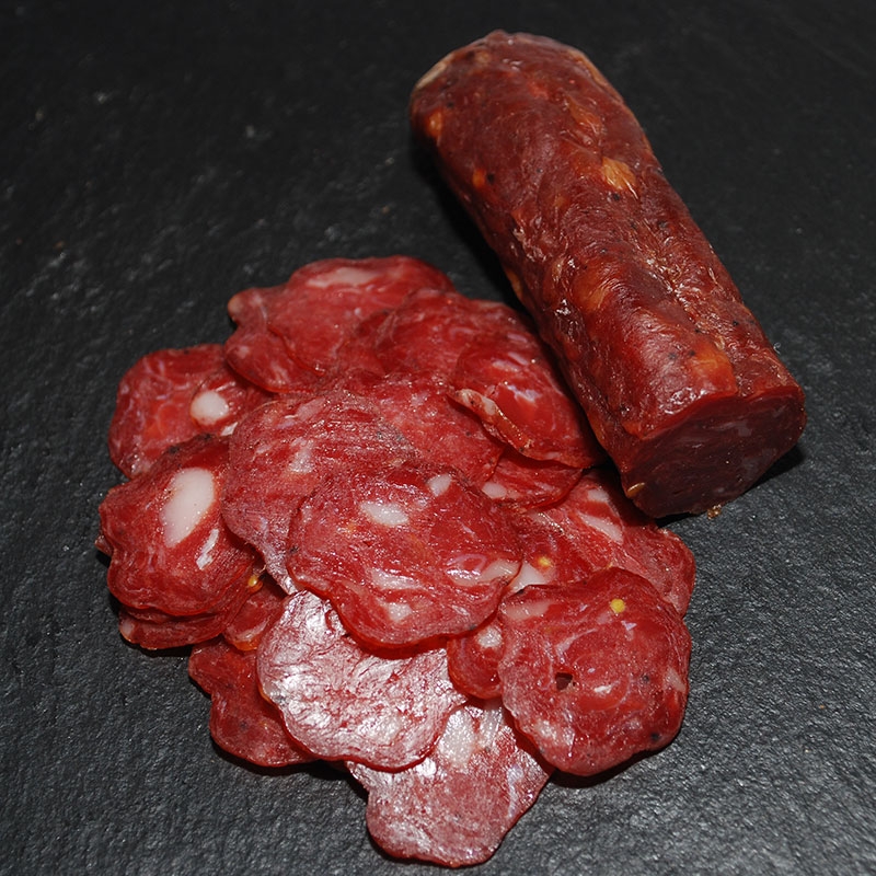 Zutaten: 100% Wildschweinfleisch, Nitritpöckelsalz (Salz, Natriumnitrit), Zucker, Pfeffer, Gewürze